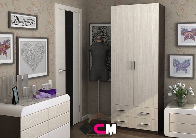 Вместительный современный шкаф Дуэт подойдет для любого интерьера. Он понравится тем, кто любит качественную, изящную мебель. В шкафу имеются штанга и выдвижные полки для вещей.
