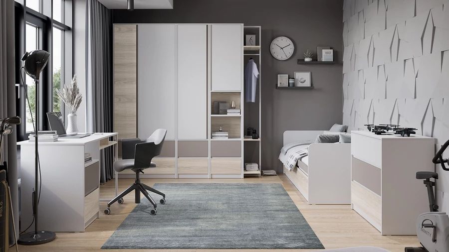 Модульность. Новинка коллекции -шкафная группа. Обновленный конструктив шкафа для одежды продуман до мелочей и изготовлен с учётом максимального удобства и комфорта. Угловой шкаф внешне похож на шкаф для одежды, который располагается вдоль стены и имеет место для хранения белья и одежды. В данном конструктиве только одна дверь распашная, а вторая является стационарной деталью и используется для создания угла. Высокая функциональность стеллажей достигается за счёт сочетания открытых полок и металлической штанги, на которой можно расположить одежду на плечиках. Стол и полка также имеют усовершенствованный конструктив, а металлические элементы окрашены белой порошковой краской. Все эти модули позволят организовать пространство комнаты исходя из ваших индивидуальных потребностей.